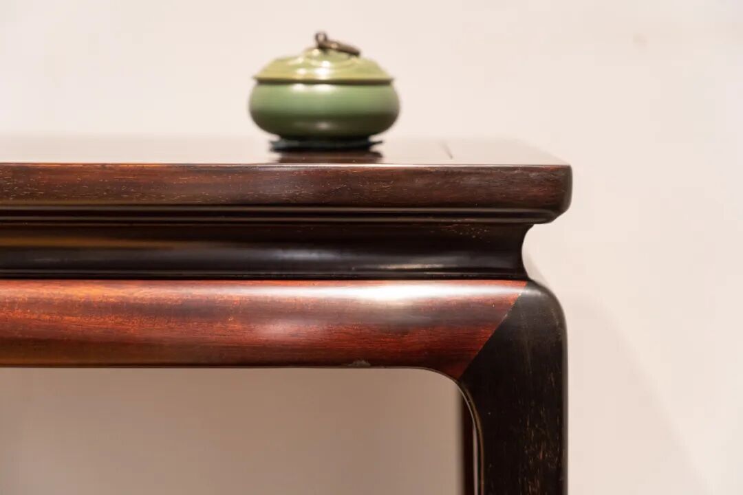 托泥早在周朝就已现雏形。在桌案类家具的腿足不落地的情况下,随附在腿足下一圈的木框结构作为承托,此木框即为“托泥”。而“托泥”的作用可使桌案的底部抬高于地面,提高了腿足的防潮和通风性能。